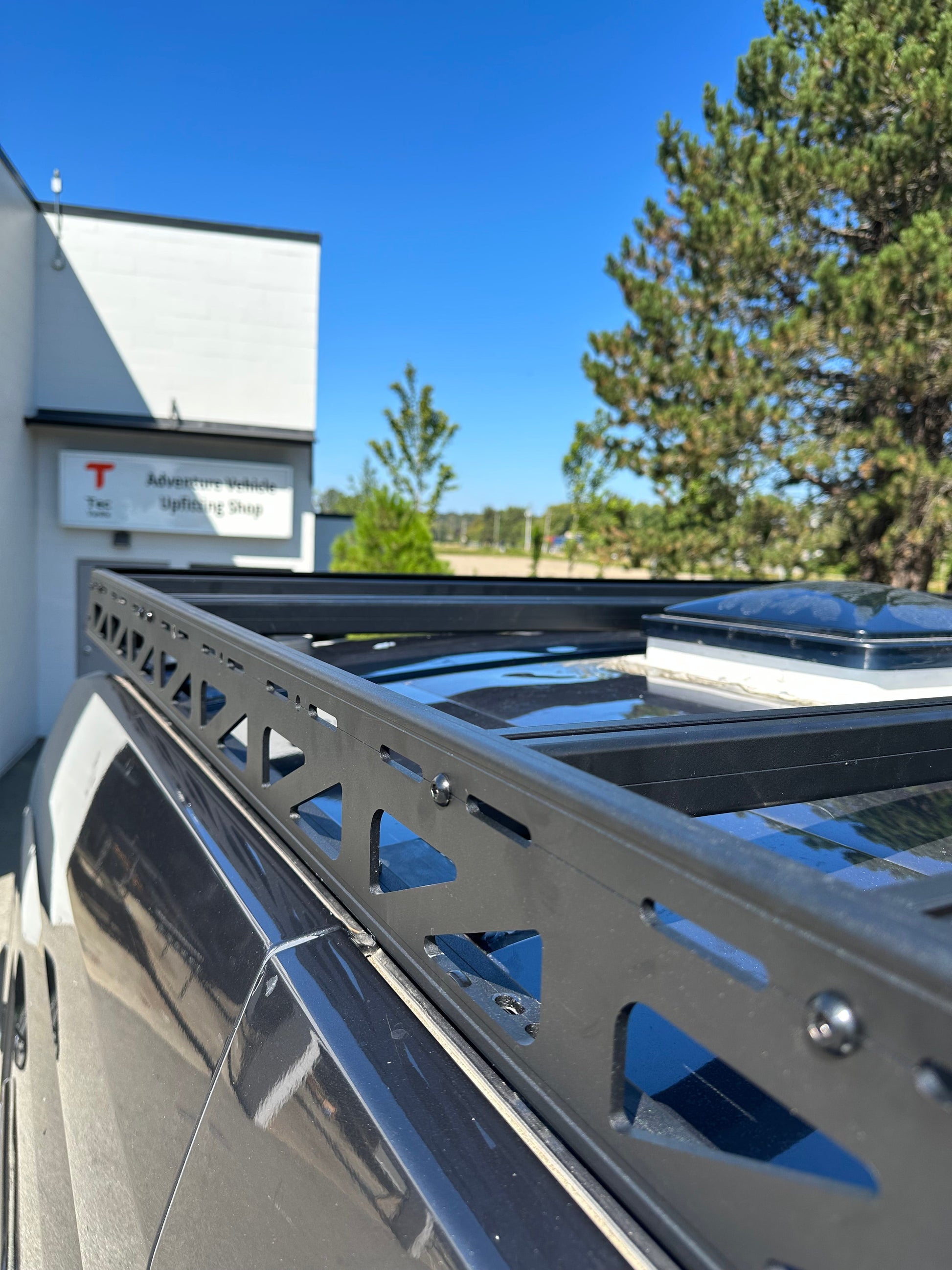 This modular roof rack provides a heavy duty platform for Ford Transit builds. High pressure molded aluminum extrusions form robust, one piece side profiles with double thick corners and reinforced side rails to support awnings and other heavy rooftop equipment without compromising stability.