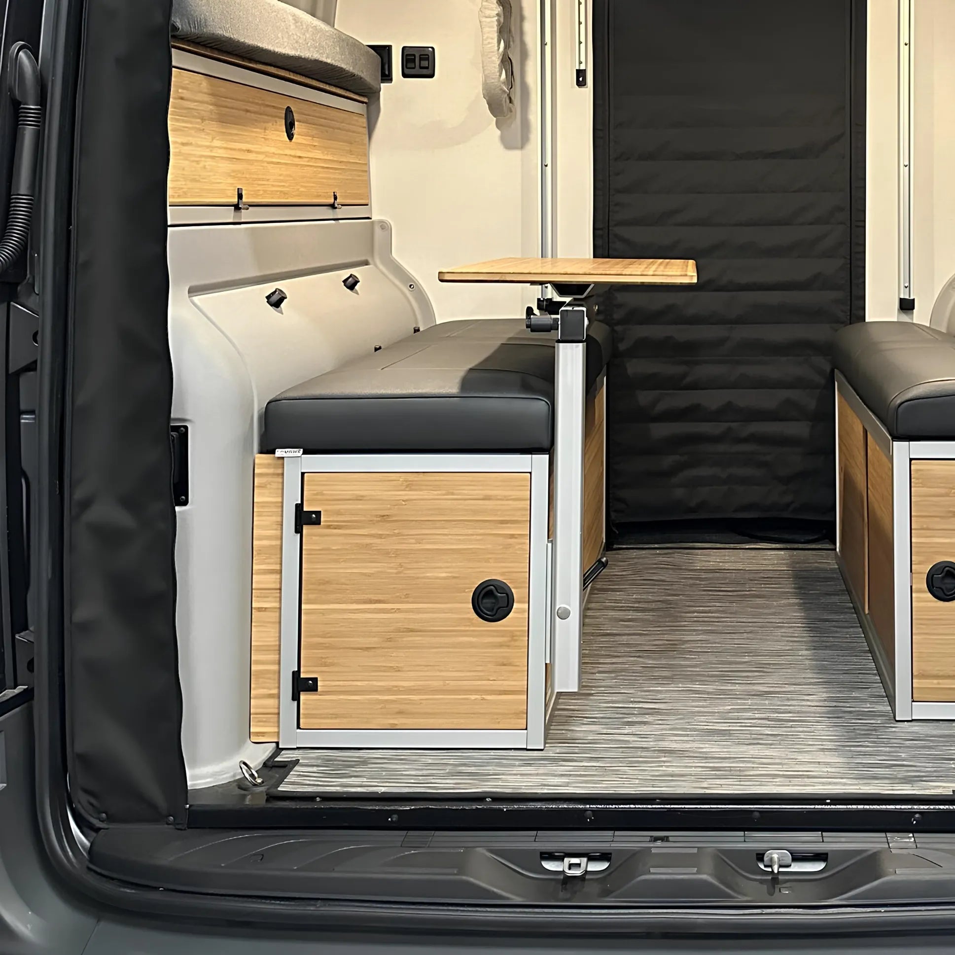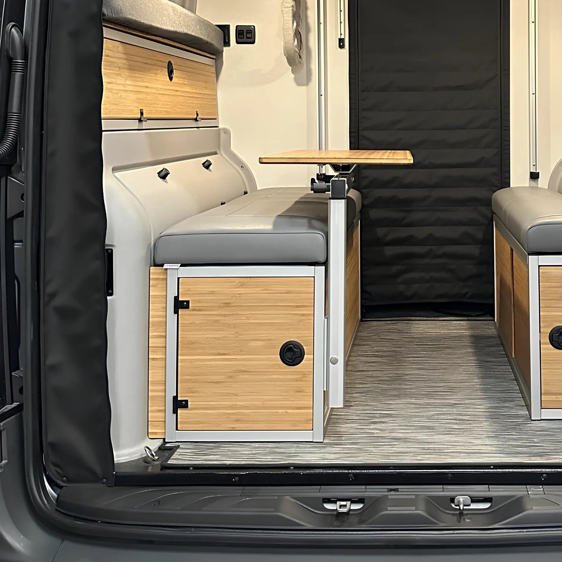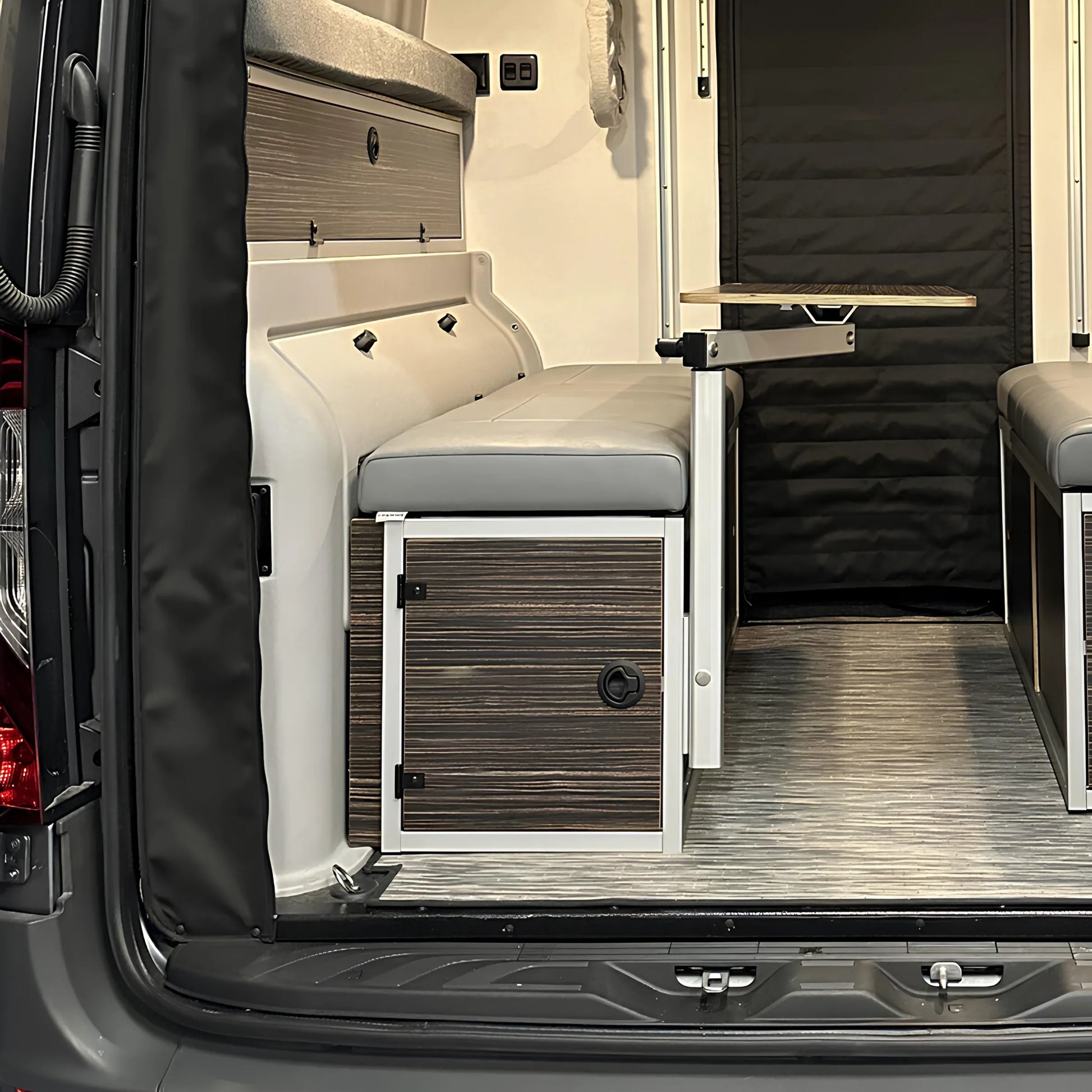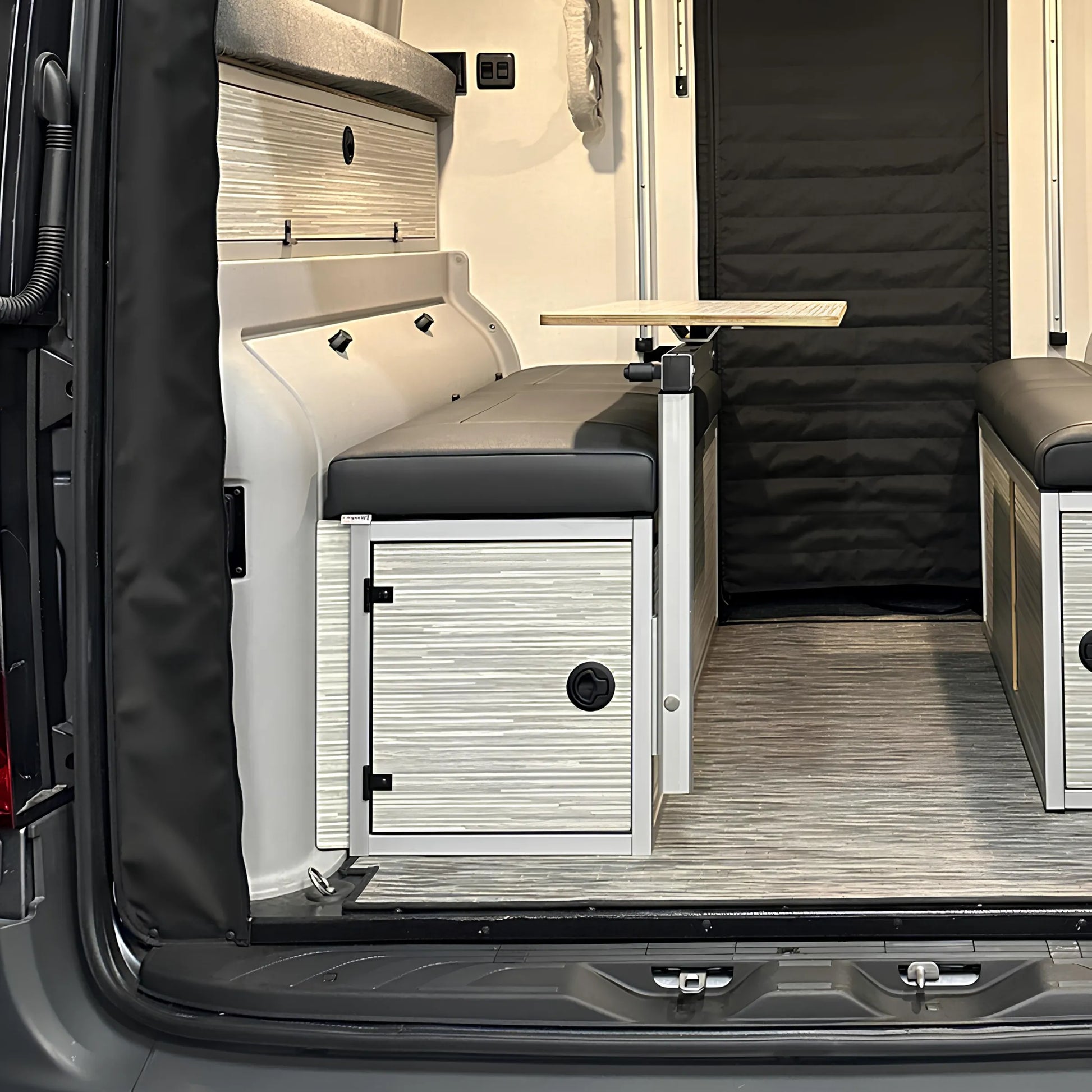 is a modular plug-n-play setup that has undergone rigorous testing for reliability and sturdiness. With no squeaking, no rattles, no shifting, and no bouncing, you can be assured of a secure, quiet space. Plus, if you wish to make it a permanent part of your van, we offer floor brackets for sale to ensure a snug fit.Winnebago Revel 4x4 storage