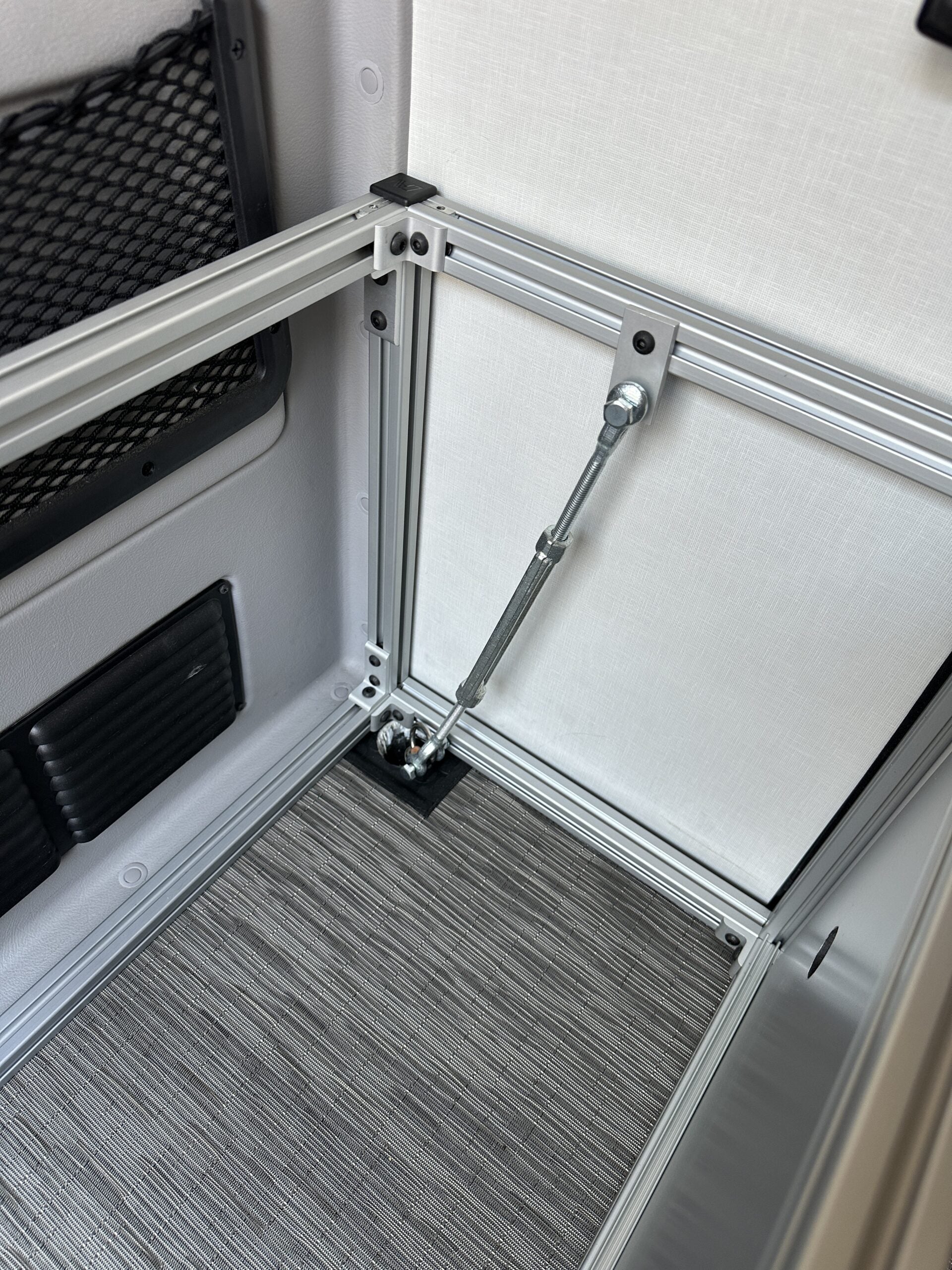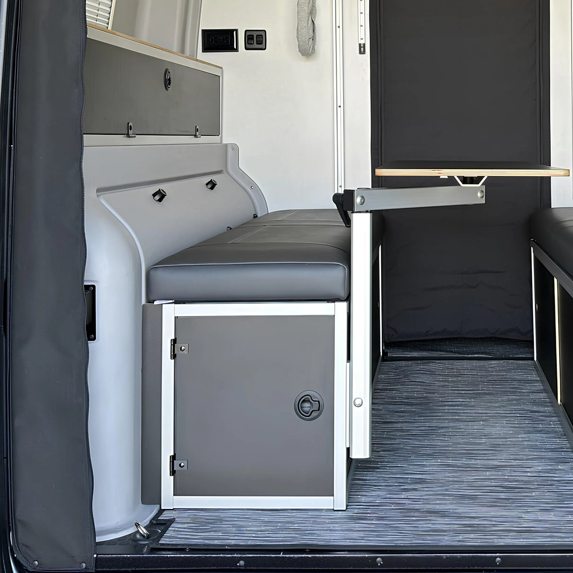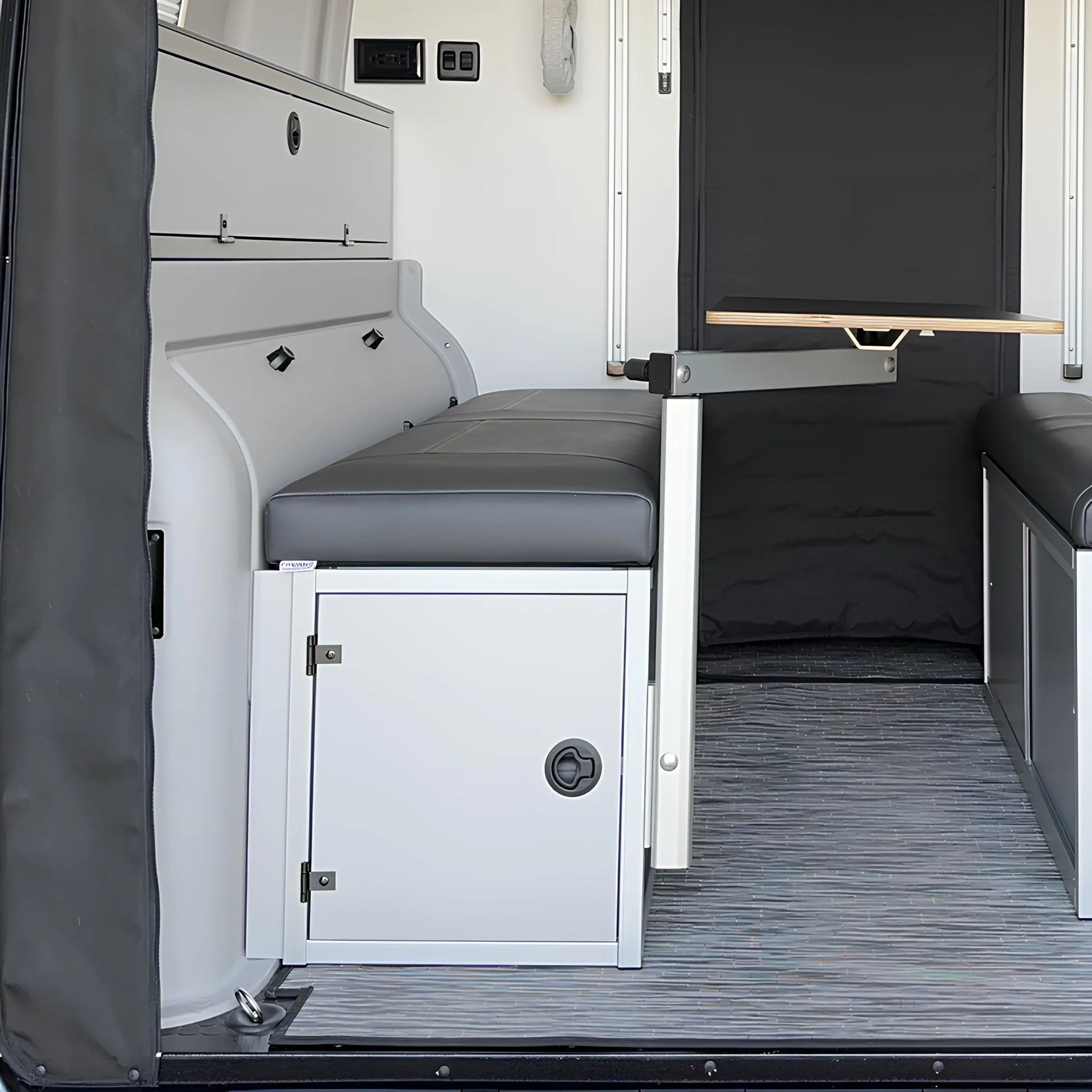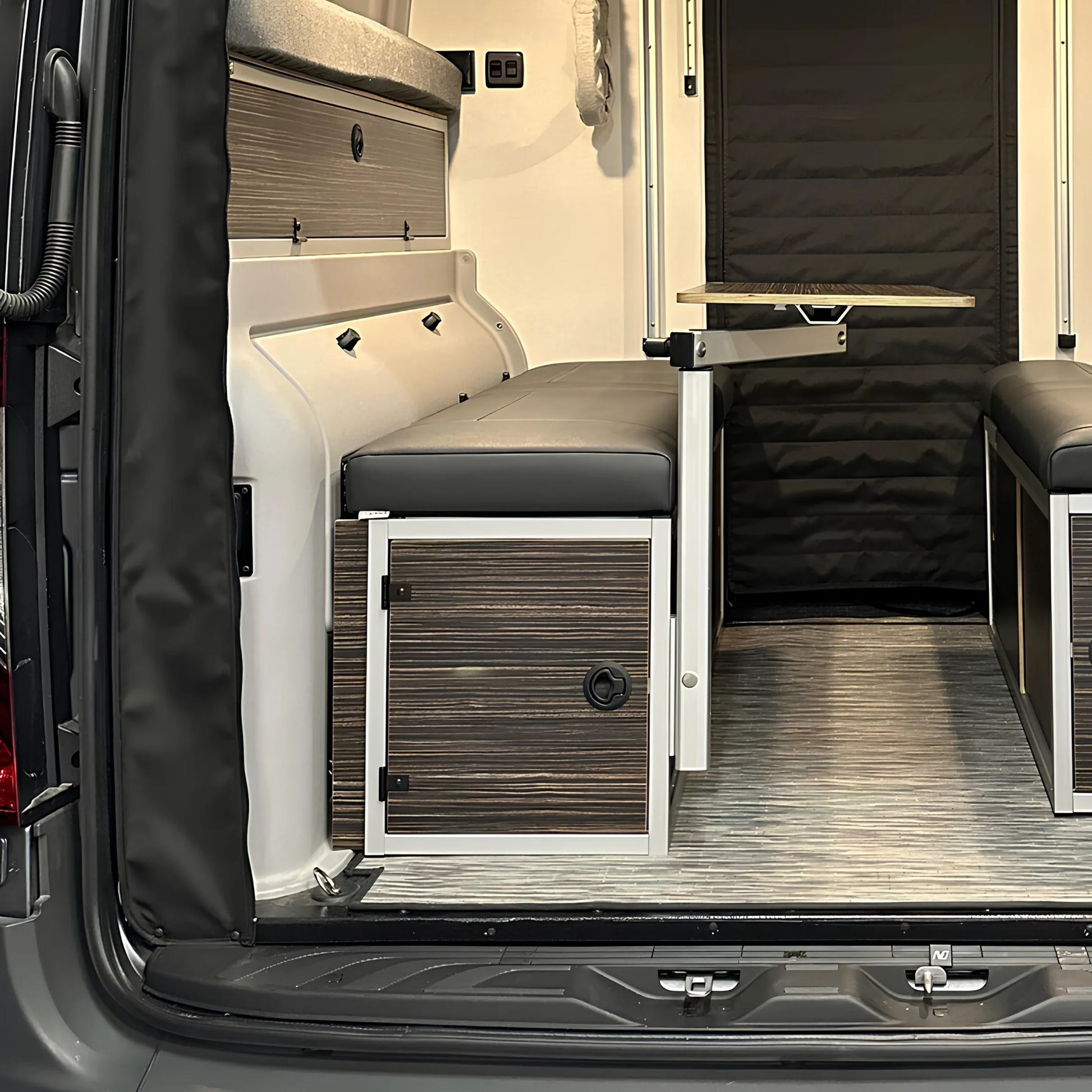 is a modular plug-n-play setup that has undergone rigorous testing for reliability and sturdiness. With no squeaking, no rattles, no shifting, and no bouncing, you can be assured of a secure, quiet space. Plus, if you wish to make it a permanent part of your van, we offer floor brackets for sale to ensure a snug fit.Winnebago Revel 4x4 storage