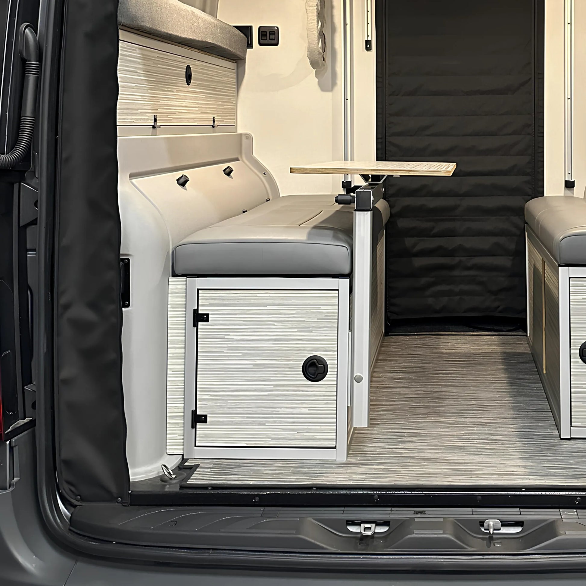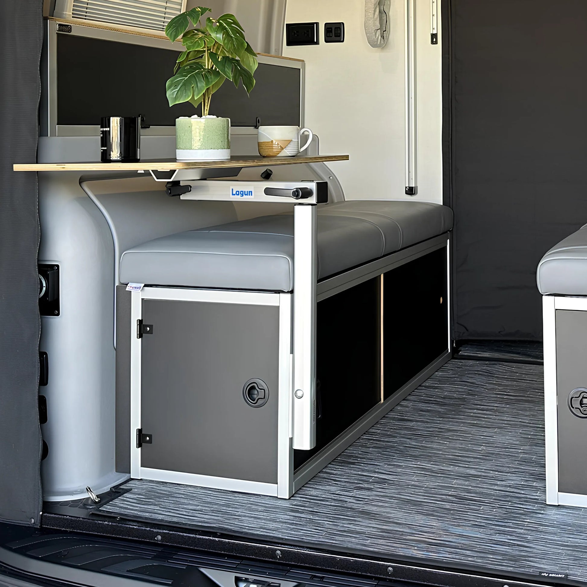 The package comes with a Lagun Mount & Table, turning your Revel Garage into a versatile lounge area. It's perfect for dining, working, or relaxing, enhancing the comfort and utility of your van. One of the key highlights of the GLSS™ 4.0 system is its storage efficiency. Offering more space than typical containers, it features sliding doors and end doors for easy access. Now, you can neatly organize your belongings while maximizing your van's available space.GLSS™ 4.0 Revel Storage.