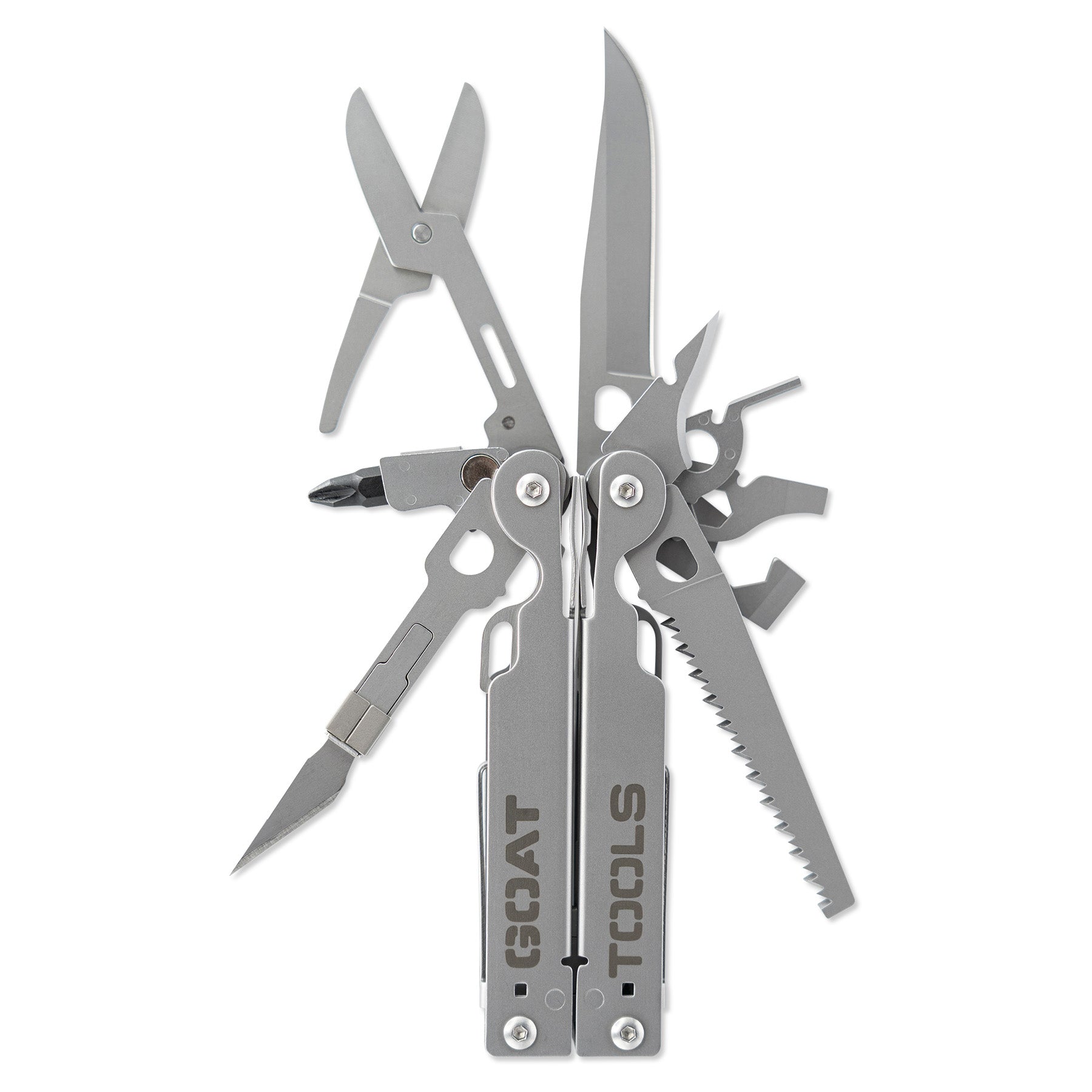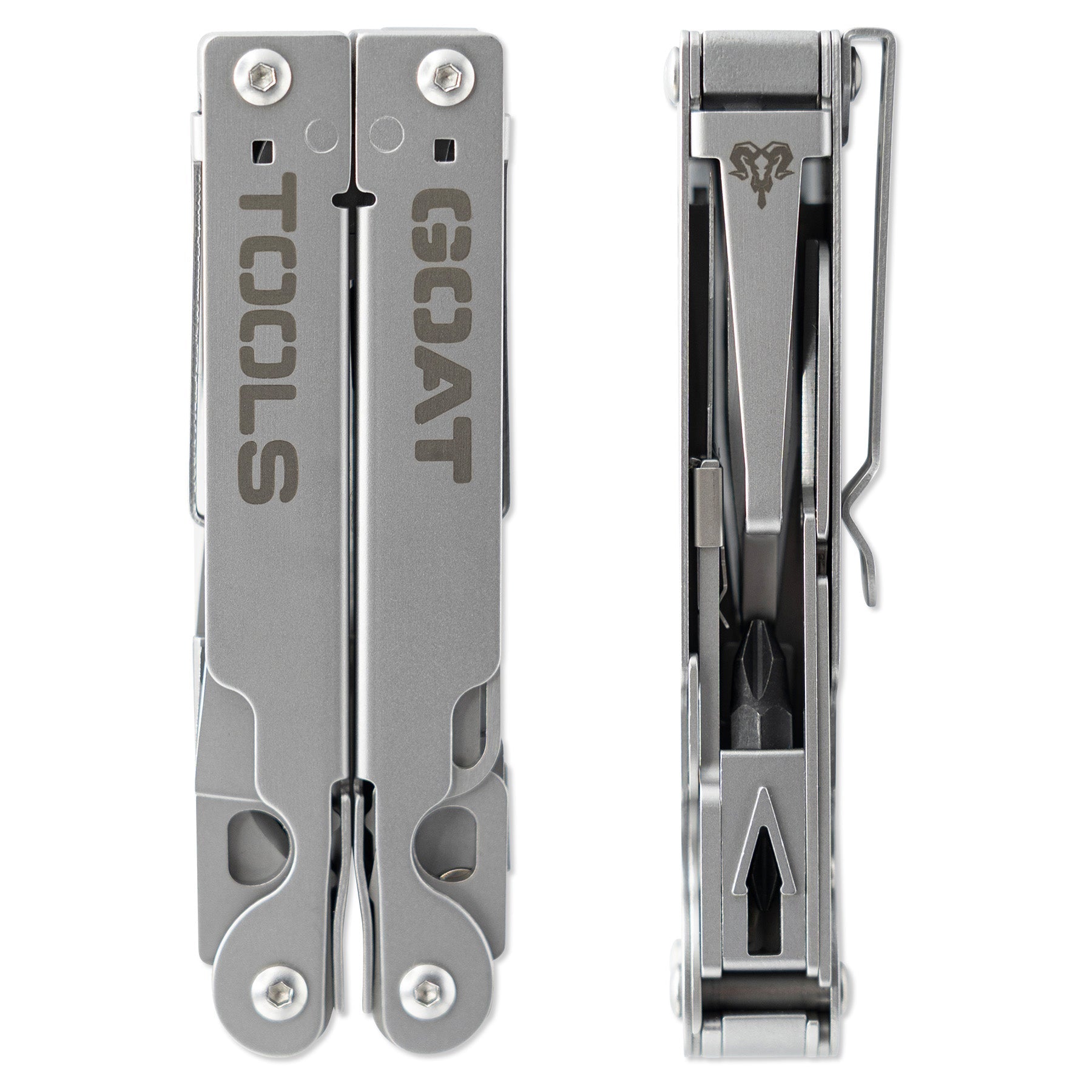 Get GOAT Tools modular multi-tool core + 9 modules (Launch configuration). Quality you can trust – Assembled in the USA. Includes Combination pliers with wire cutters, main blade, saw, scissors, hobby blade holder, full-size bit-driver, awl, small flathead, 10mm wrench + medium flathead, 2mm allen/hex wrench, and a nylon MOLLE sheath. Plus all the listed add-ons!