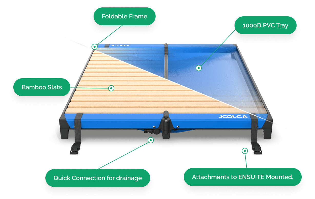 Compatible with all Joolca tents, the ENSUITE Shower Base lays proper bathroom flooring in seconds. It’s the real deal through and through. A sturdy extruded aluminium frame with glass-filled nylon elbows. A slanted capture tray in welded PVC. An elevated bamboo deck with marine-grade, UV-stabilised clear coat. Stainless steel fixtures. And efficient drain ports for leading water away from the campsite or recirculating back to your HOTTAP.