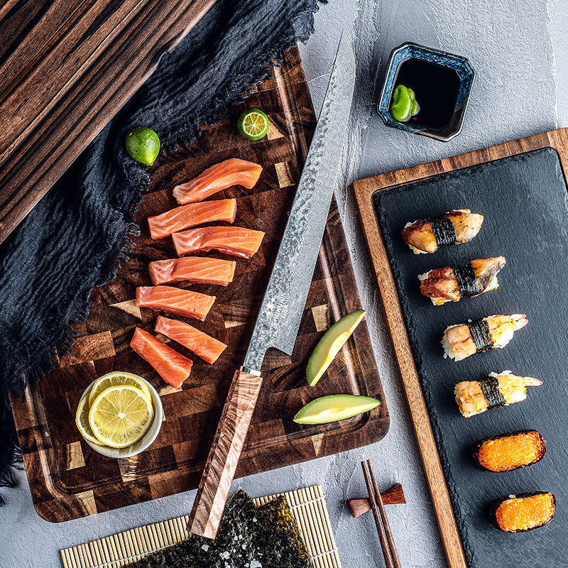 Prime Custom Japanese Slicer Knife with Exotic Olive Wood Burl Handle