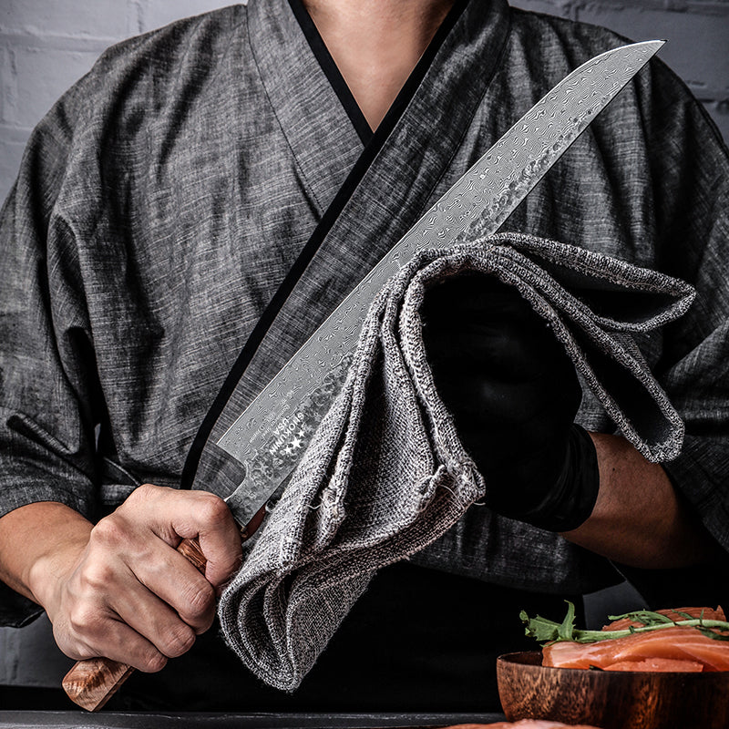 Prime Custom Handmade Japanese Slicer Knife - VG-10 & 15n20 Damascus Steel Blade with Stabilized Olive Burl Wood Handle, Full Tang Fixed Blade Professional Chef Knife, Knife Sharpening & Personalization