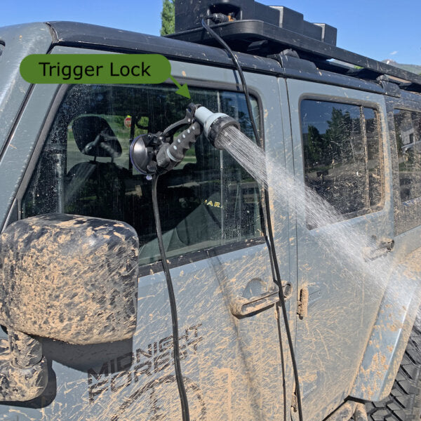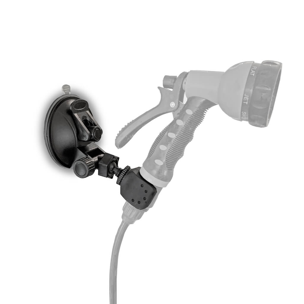 Camp showers made easy! This suction cup nozzle holder is designed to work with our Rain Flux hose pump.