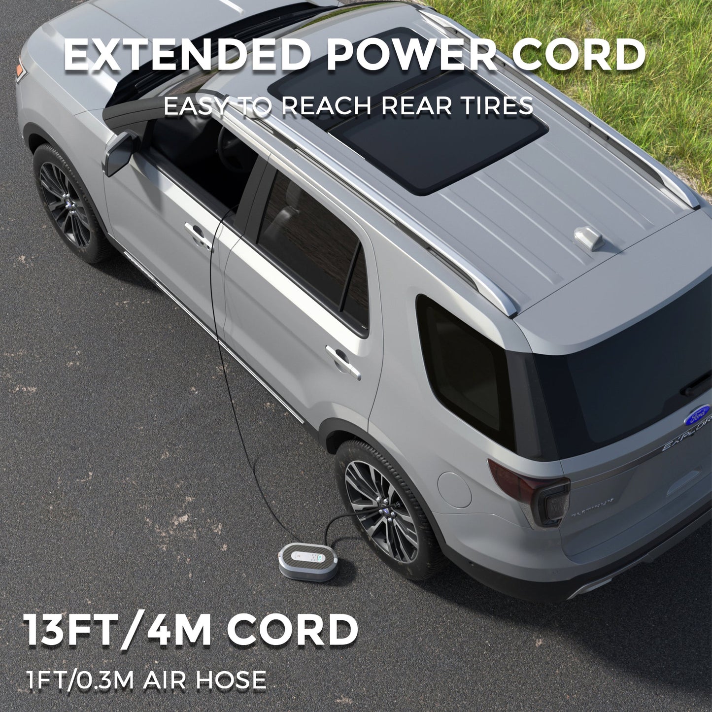 Giraffe Tools The Retractable Air Compressor-Tire Inflator with 34L/MIN fast inflation feature can inflate a 195/65 R15 car tire from 30PSI to 36PSI within 1 minute.