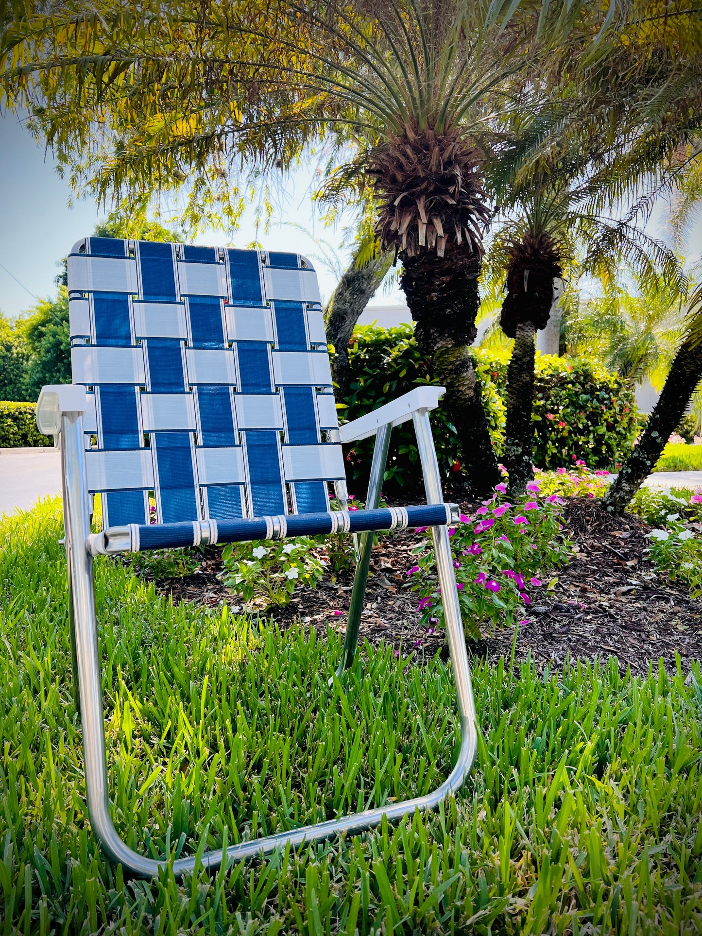 Our newest chair is here. Based off our most popular Charleston pattern, this new chair is one of our favorites. The deep blues and whites play off each other perfectly to make a chair that is not only comfortable, but beautiful to look at. When in the shade the chair has a nice deep blue while in the sunlight the chair lightens up to a brighter royal blue.