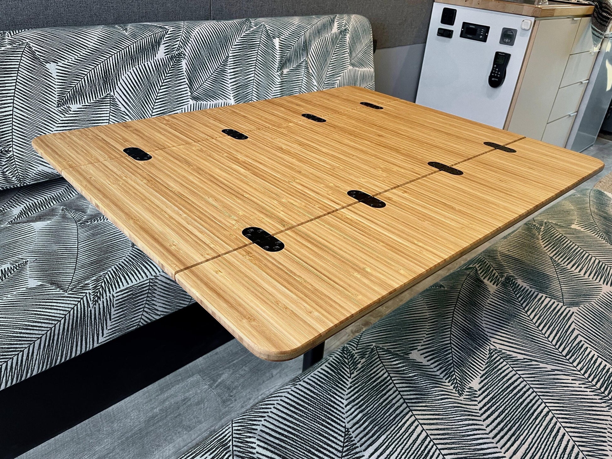 This is a larger version of our original best selling folding bamboo table. Add more workspace and flexibility to your camper with this folding bamboo table. When folded closed it is 35"x14 1/2", when fully extended it measures 35x29". Hinges are on top and exposed in the open position. Perfect for installing between two bench seats, goes from a slim happy hour table into a large dining table. You can use a Lagun mount or a single pedestal mount as shown in the pictures (not included).