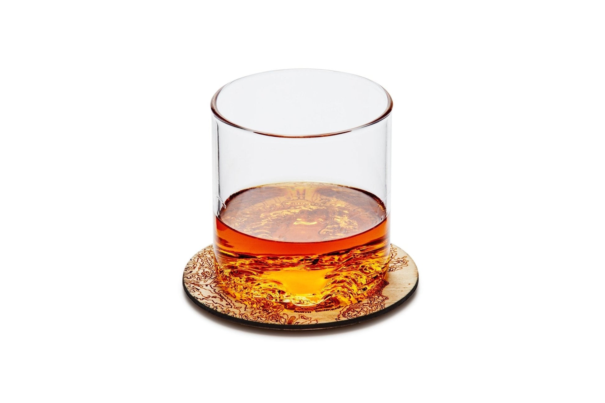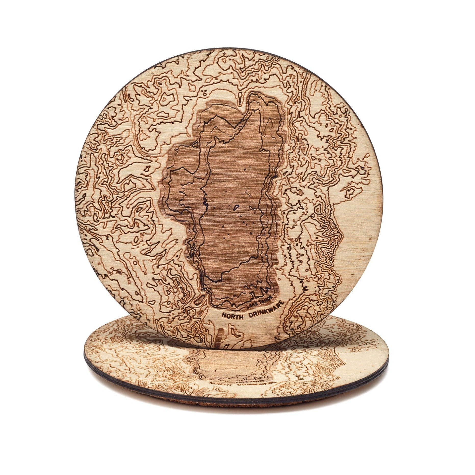 Custom wood coasters featuring the stunning topography and bathymetric data of Lake Tahoe. Set of 2 coasters of laser-cut birch ply with a cork backer. Made in USA and packaged in custom muslin bag.