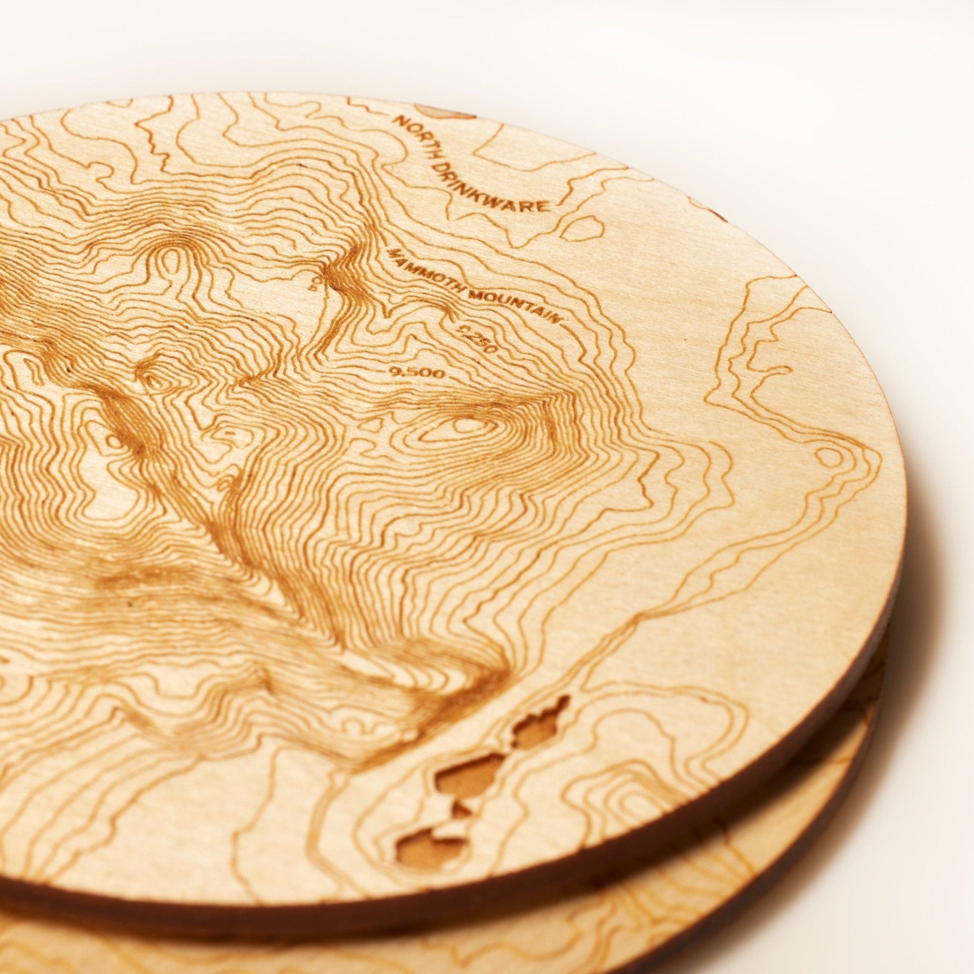 Custom wood coasters featuring USGS topographic data for Mammoth Mountain located in the heart of the Sierra Nevada. Set of 2 coasters of laser-cut birch ply with a cork backer. Made in USA and packaged in custom muslin bag.