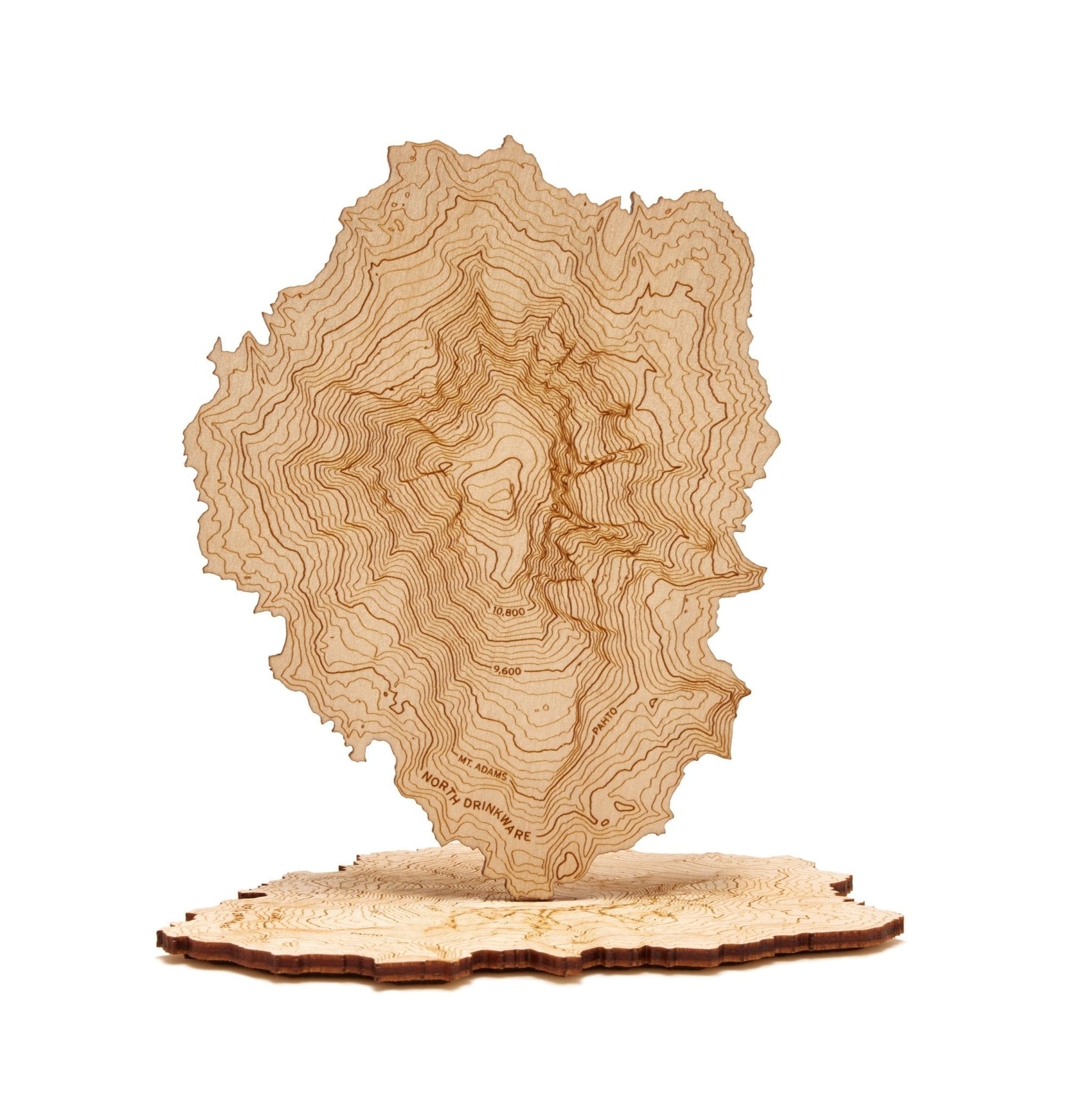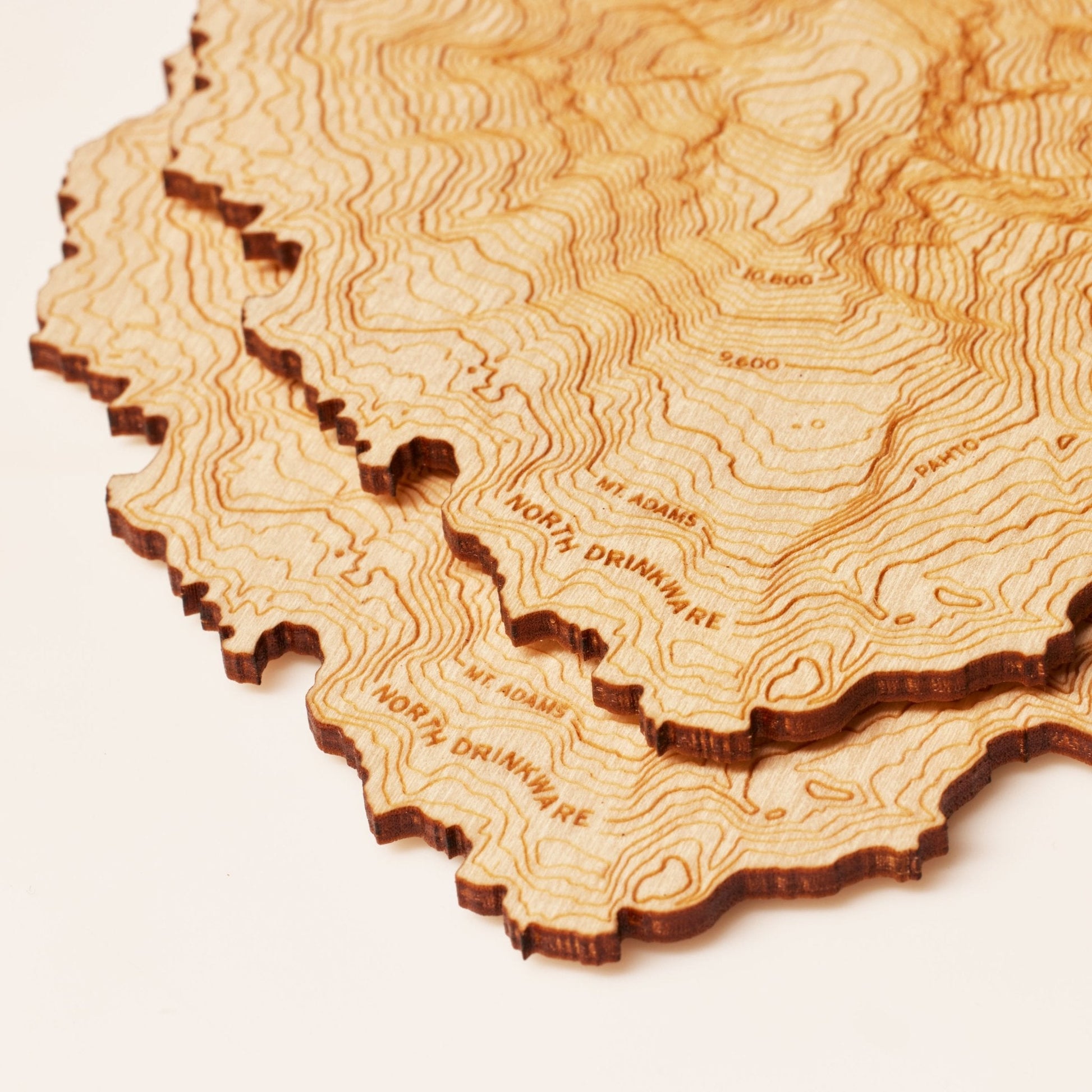 Custom wood coasters featuring USGS topographic data for Mt. Adams - Known as Pahto to the Yakama Nation and Washington's second tallest peak at 12,280 feetSet of 2 coasters of laser-cut birch ply with a cork backer. Made in USA and packaged in custom muslin bag.