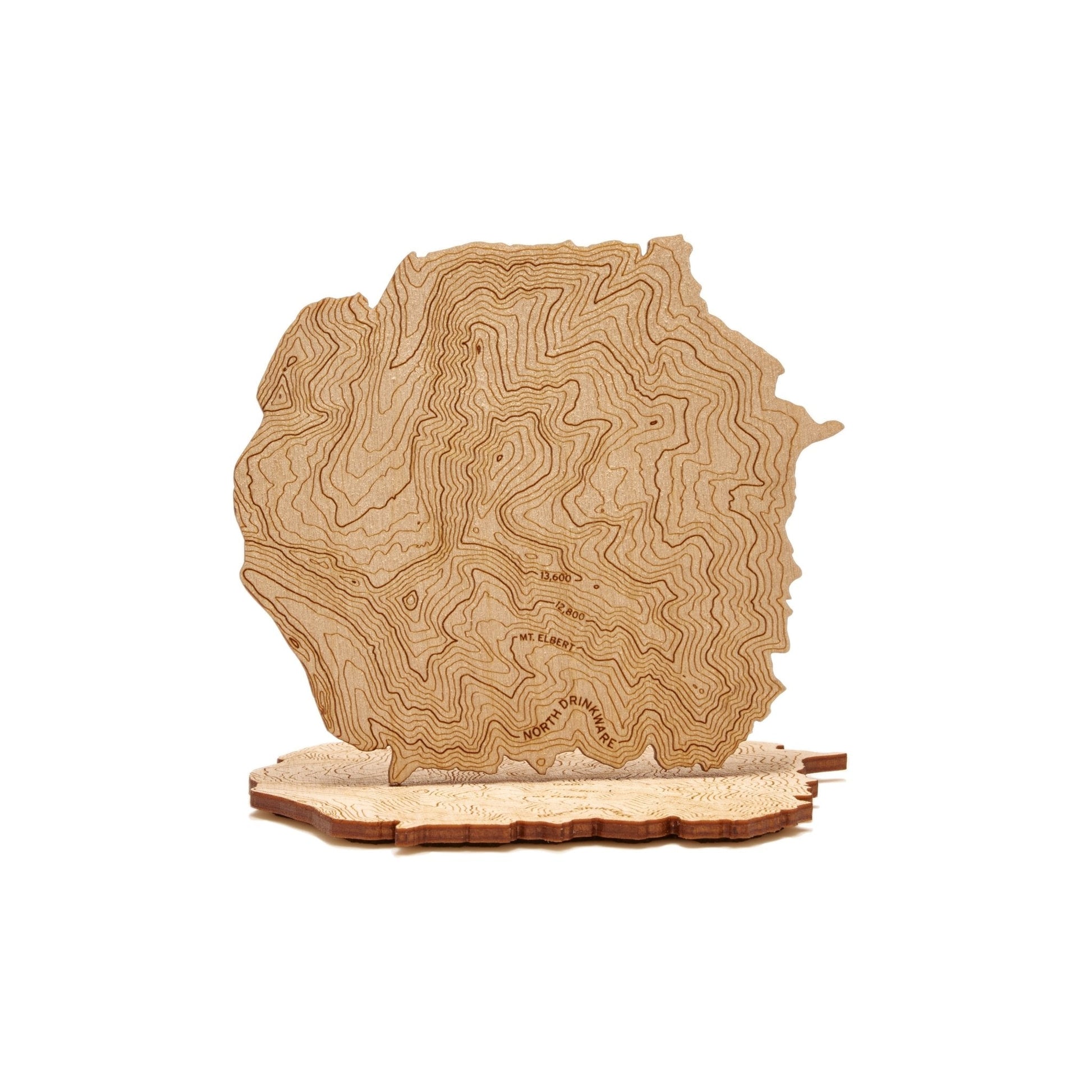 Custom wood coasters featuring USGS topographic data of Mt. Elbert, Colorado's tallest peak. Set of 2 coasters of laser-cut birch ply with a custom-cut cork backer. Made in the USA and packaged in a custom muslin bag.