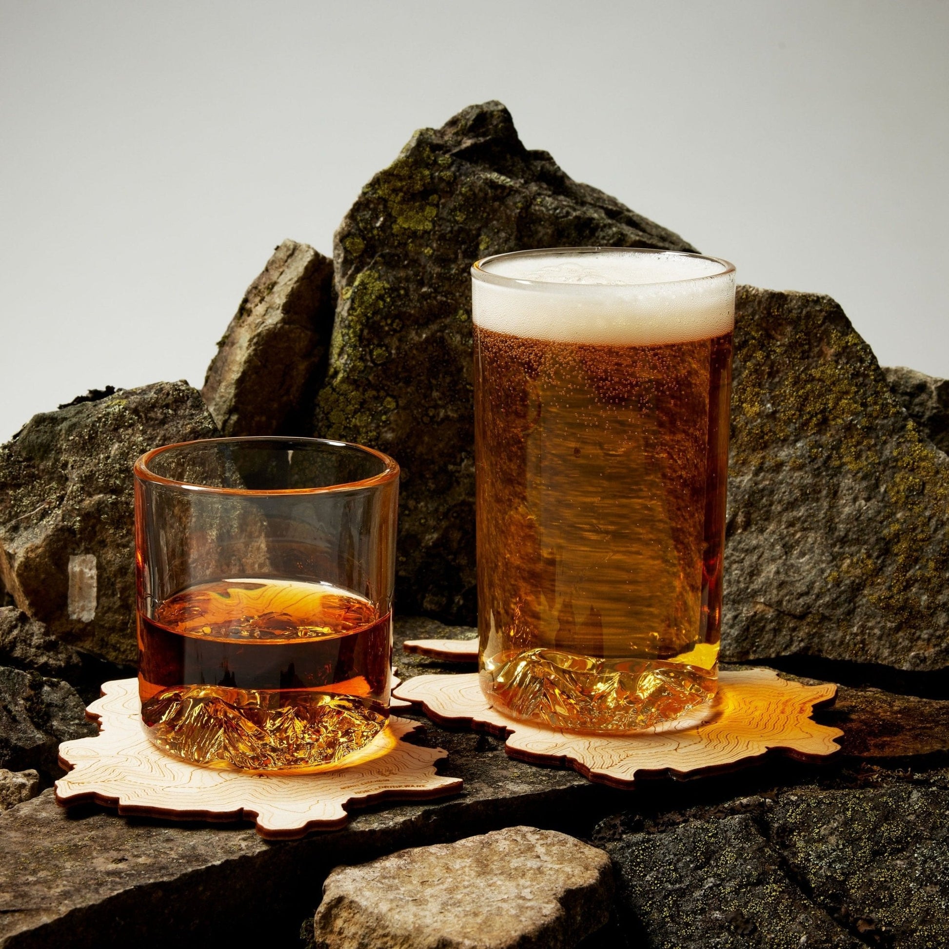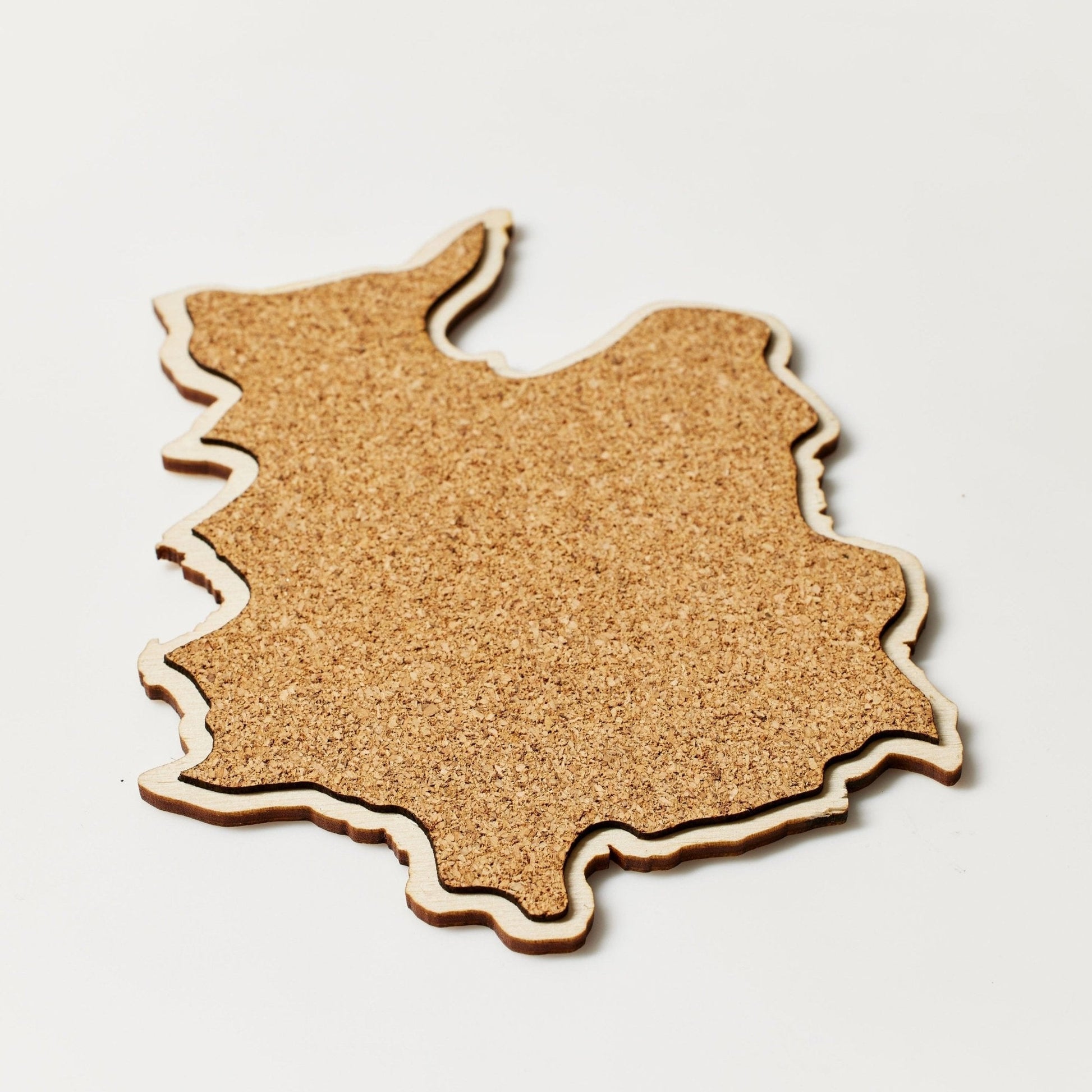 Located in Maine's Baxter State Park, Mt. Katahdin, translated to "Great Mountain" by the Penobscot Nation, stands at an elevation of 5,269 feet. Set of 2 coasters of laser-cut birch ply with a custom cut cork backer. Made in the USA and packaged in a custom muslin bag.