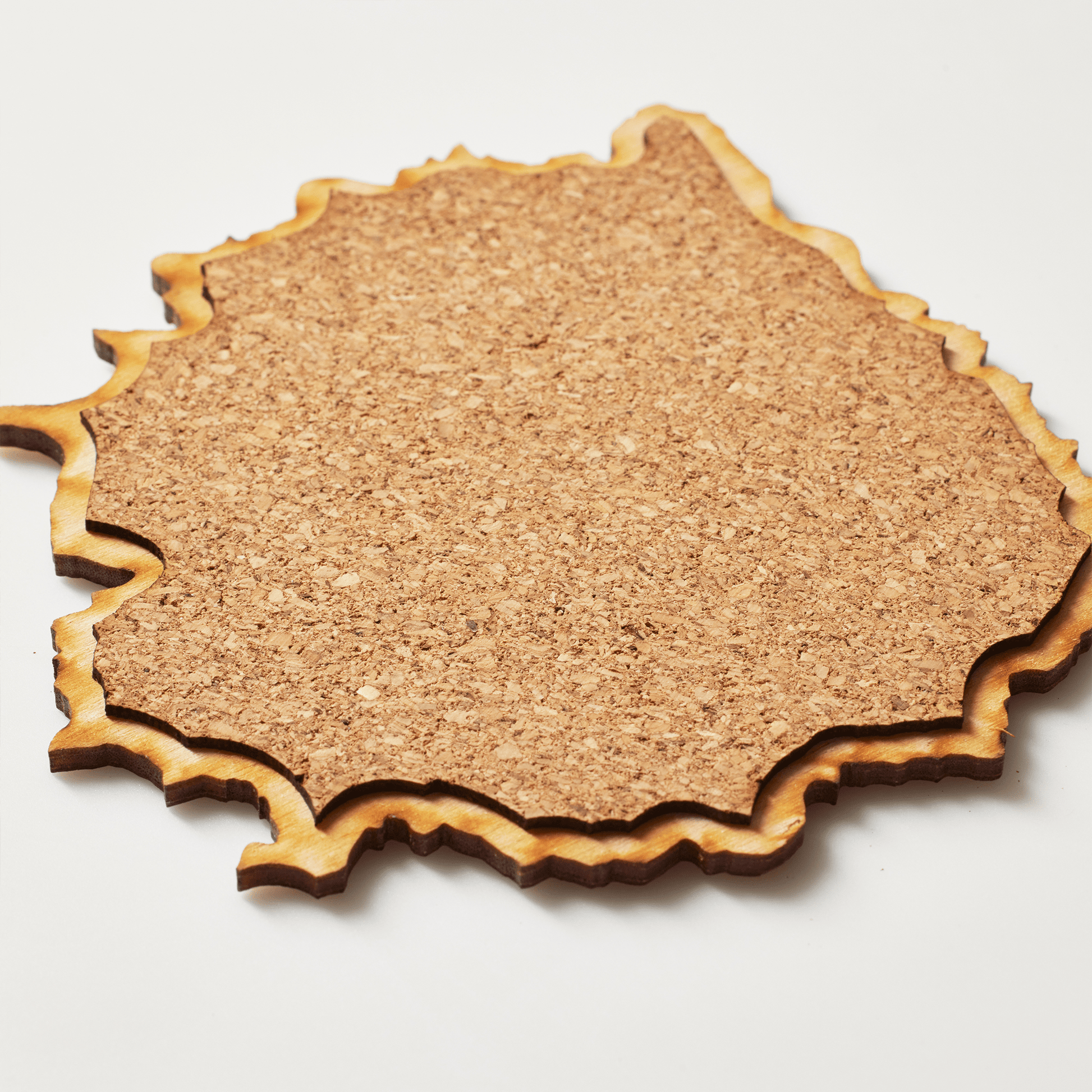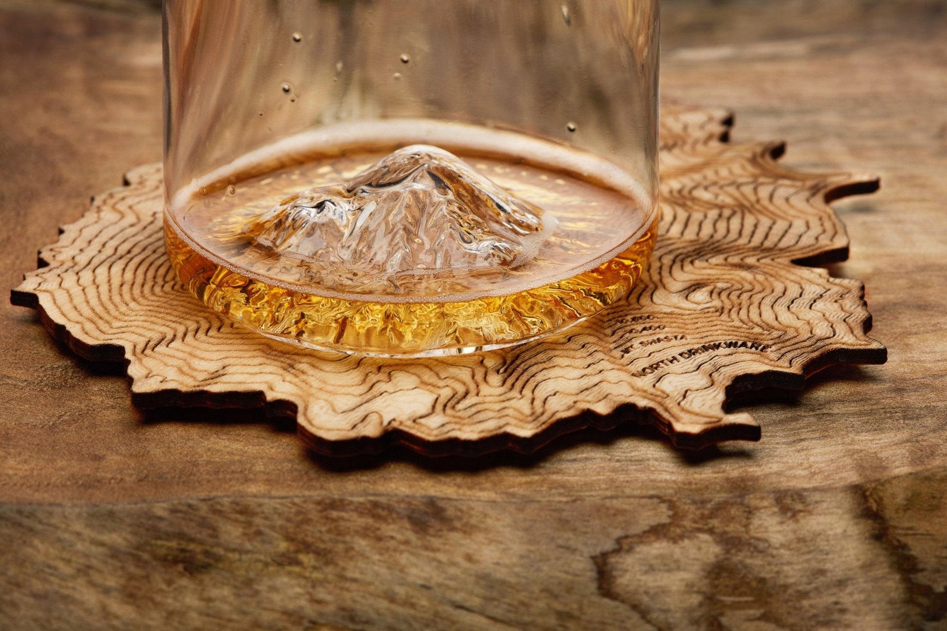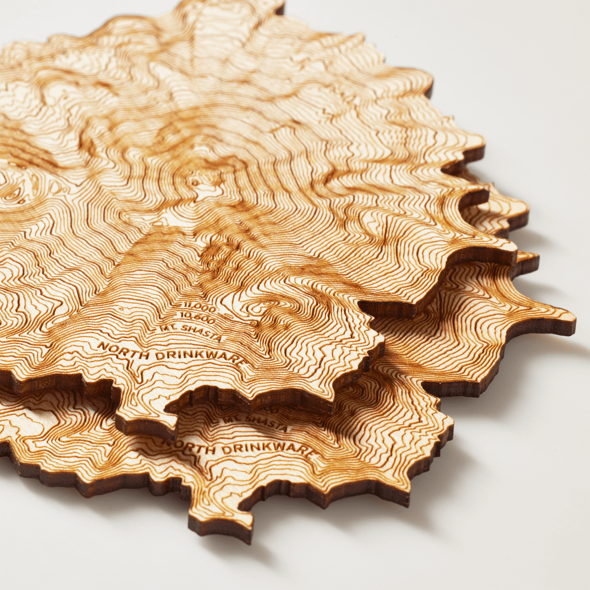 Custom wood coasters featuring USGS topographic data for Mt. Shasta at the southern end of the Cascade Range in California at 14,179 ft. Set of 2 coasters of laser-cut birch ply with a cork backer. Made in USA and packaged in custom muslin bag.