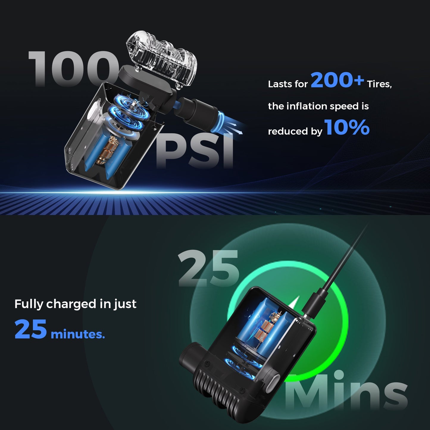 With a high-capacity battery and Airvortech technology, TINY BIKE PUMP can inflate two 700*25c tires from 0 to 80PSI with ease and reach a maximum pressure of 100PSI. It's a reliable and powerful tool that can inflate a tire to 80PSI in just 80 seconds.