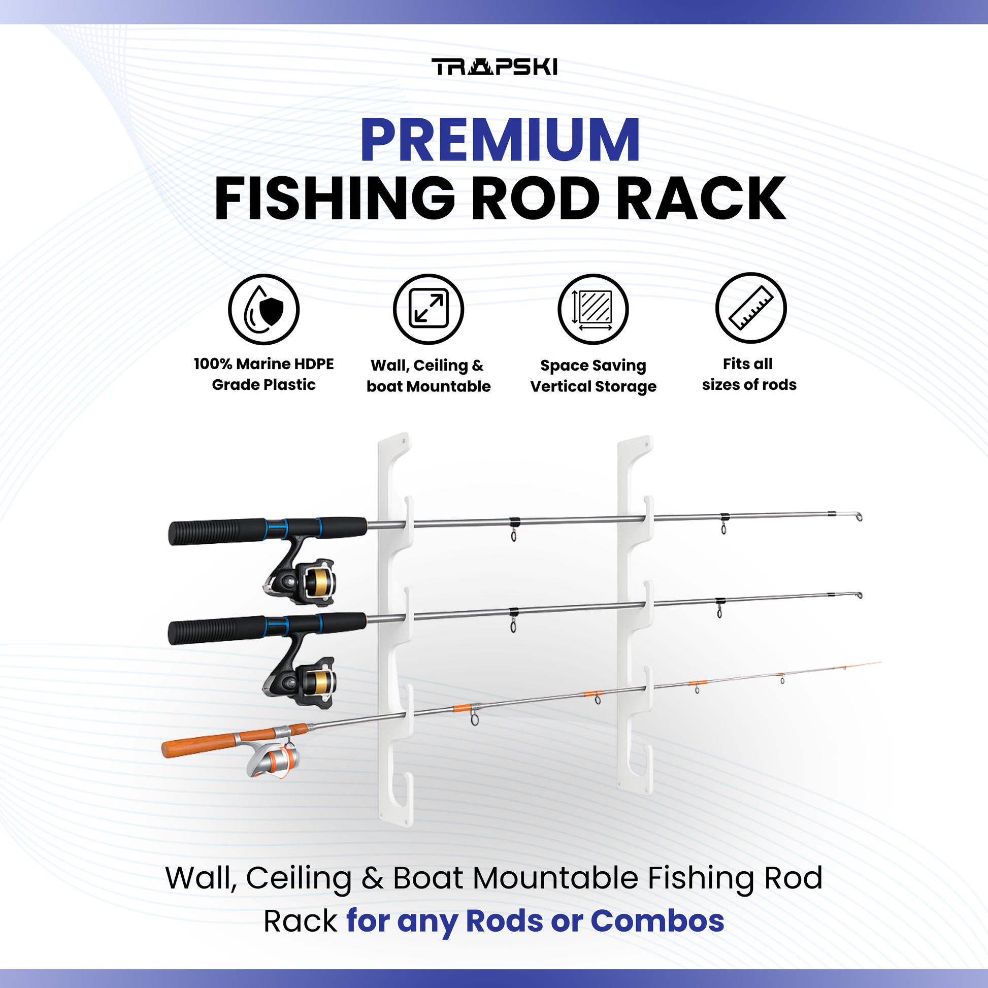 The TRAPSKI Wall Fishing Rod Rack was designed by Angler's for Angler's! Whether you fish the deep sea or your local honey hole, keeping your gear organized and protected is important. It is made with Marine Grade HDPE and comes with Stainless Steel hardware so you can mount it on a wall or ceiling in your garage, shed, storage area, boat or outside if you want! The simple design can handle Deep Sea, Inshore or Freshwater rods with or without reels!